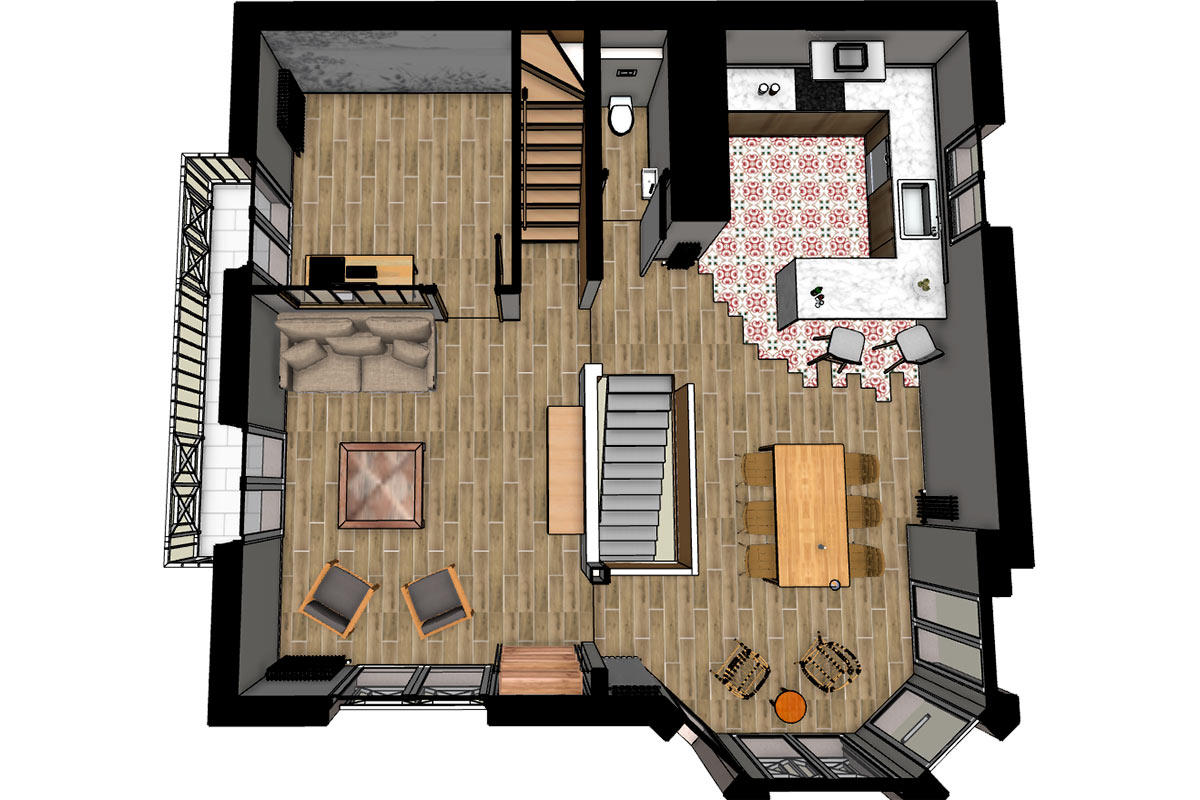 - La cuisine toute équipée (lave vaisselle, induction, four et micro-onde) est directement ouverte sur la salle à manger. Son bar et tabourets de bar hauts permettent de tenir compagnie au/la cuisinier.e.